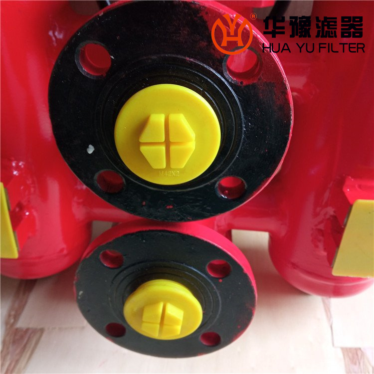 工作特點是當一只濾芯堵塞致使進出口壓差為0.35MPa時,發訊器發訊,這時,轉動換向閥,使備用濾油器工作,然后更換已堵塞的濾芯;如因故不能及時更換已堵塞濾芯,使進出油口壓差進一步上升到0.4MPa時,旁通閥會自動開始工作,從而保護濾芯及系統正常工作,但用戶應盡快更換濾芯;