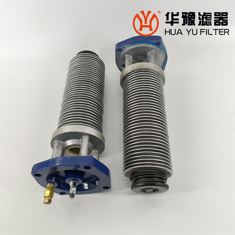 每一濾芯組件由濾器蓋、濾芯套筒、濾片及濾片圈等組成,濾器蓋頂部裝有放氣閥,供排出濾器內腔的空氣用。 濾片套在濾芯套筒上,是濾器的主要過濾元件,由濾網,支承網及波紋隔盤等組成,濾網的網目數由用戶根據需要選用。轉換閥體是由鑄鋁鋁合金制成的椎體,與閥孔研磨配合,閥體上鑄有上下兩油道孔,上油道孔一端通濾芯上方油腔,一段通濾器出口,下油道孔一段通濾芯腔,一段通濾器進口,當轉換閥迅速從一極限位置轉至另一極限位置時,閥體將一濾芯腔的通路關閉,而將另一濾芯腔的通路打開,此時,壓力油從濾器進口流入濾芯腔,經濾網過濾后的清潔油經上方油腔從出口流出,達到濾清油液的目的。轉換閥體軸端頭上的箭頭指向接通的濾芯腔的一邊。